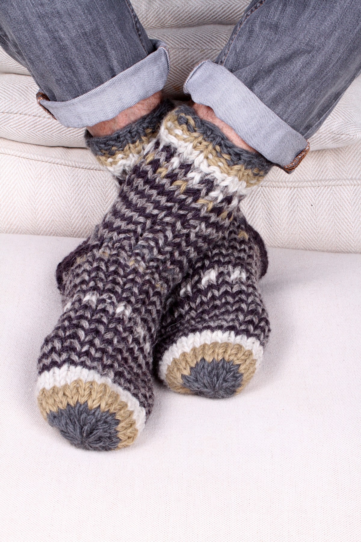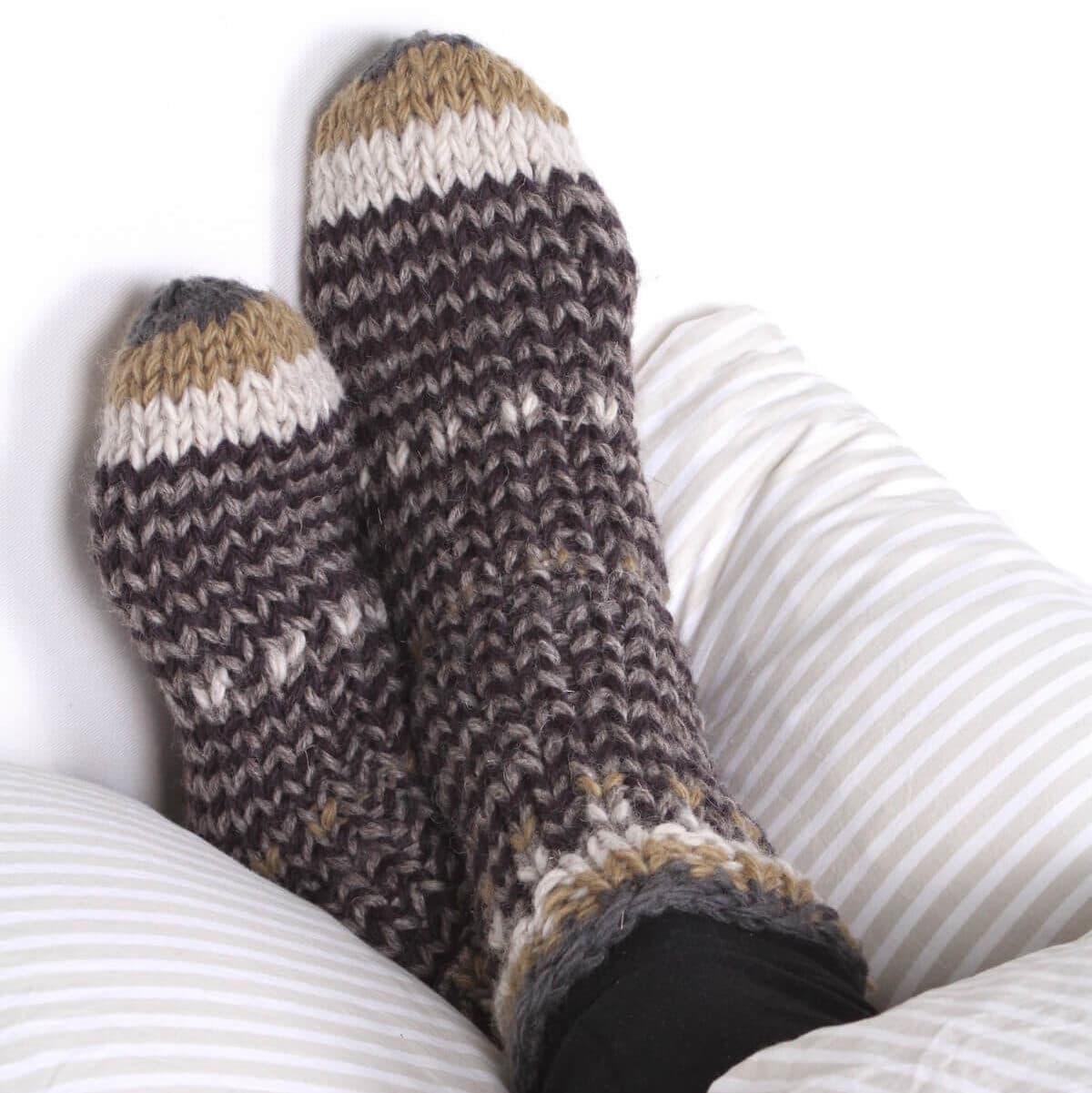 These soft, pure wool fairly-traded men’s sofa socks have been lovingly hand-knitted with in Nepal by Pachamama’s cared-for community of caring knitters. So you can in turn care for your feet. One size, to fit large man-sized feet.