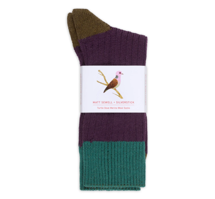 The socks are made in Britain from merino wool and the colours are inspired by Matt Sewell’s painting of the Merlin, an endangered bird on the UK’s red list.