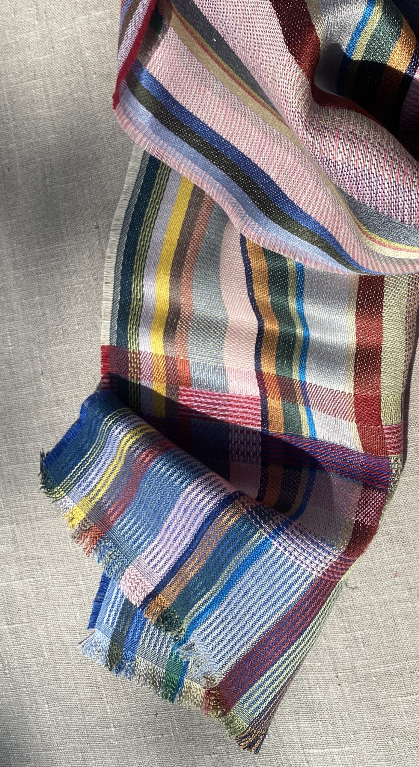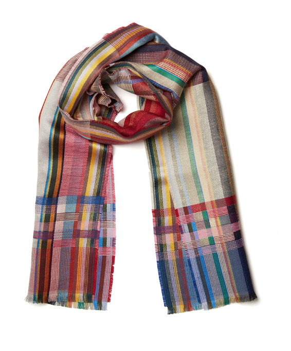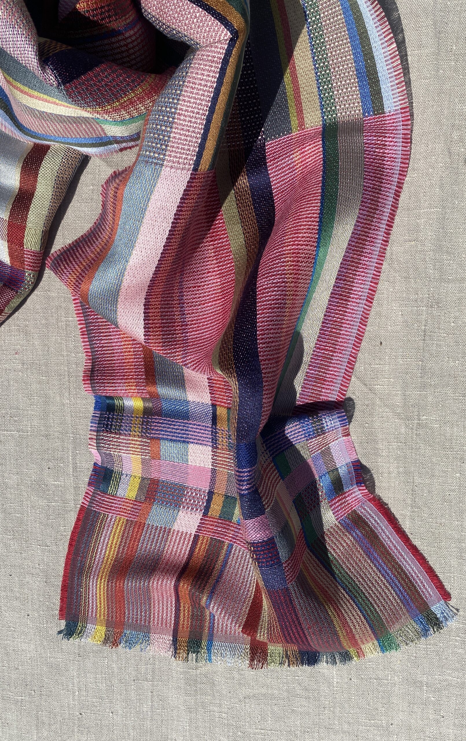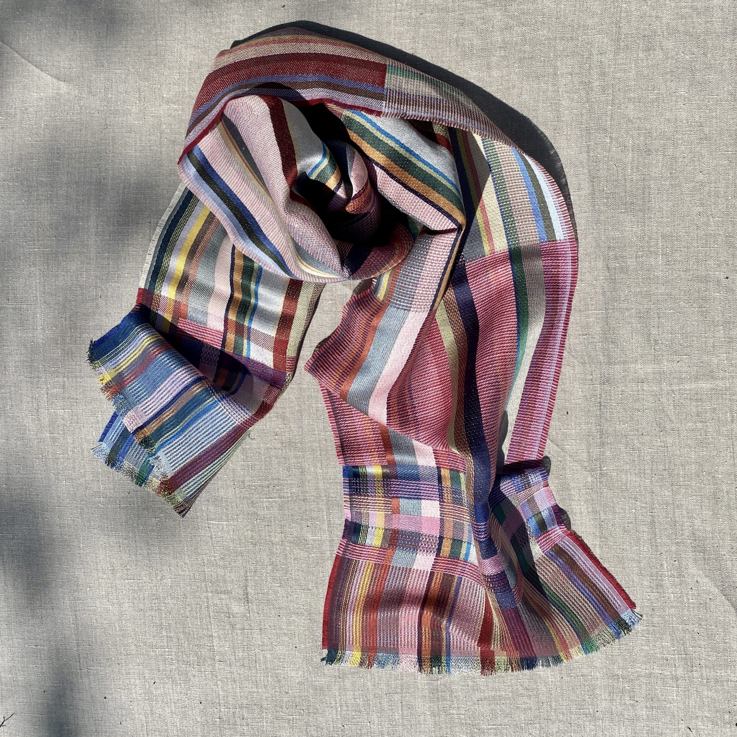 A soft silk and linen woven scarf with a punchy colour palette. A mix of intricate pattern and texture within bold block stripes.