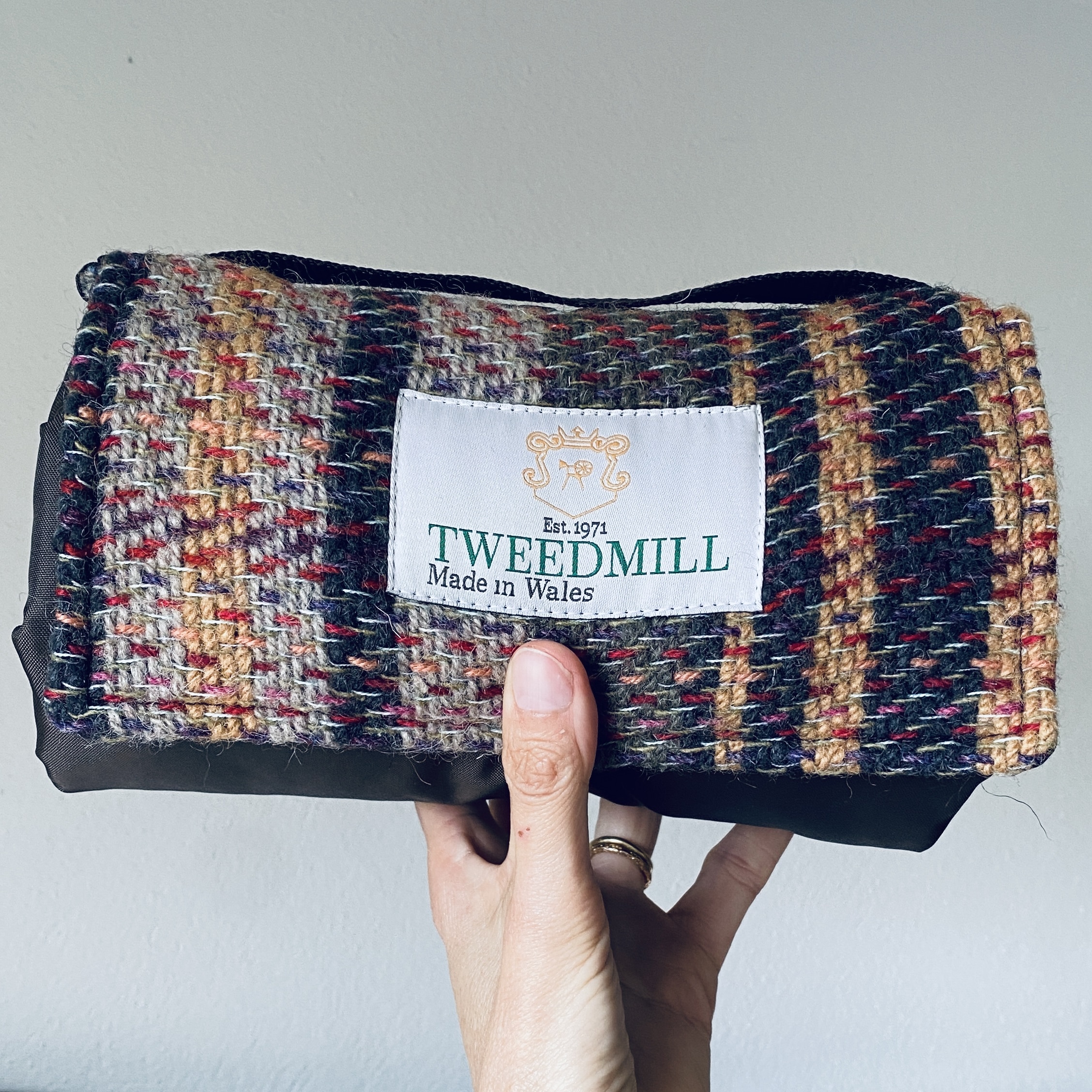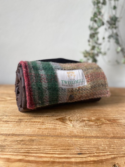 Recycled wool top and cotton wax all-natural waterproof underside with carry handle.